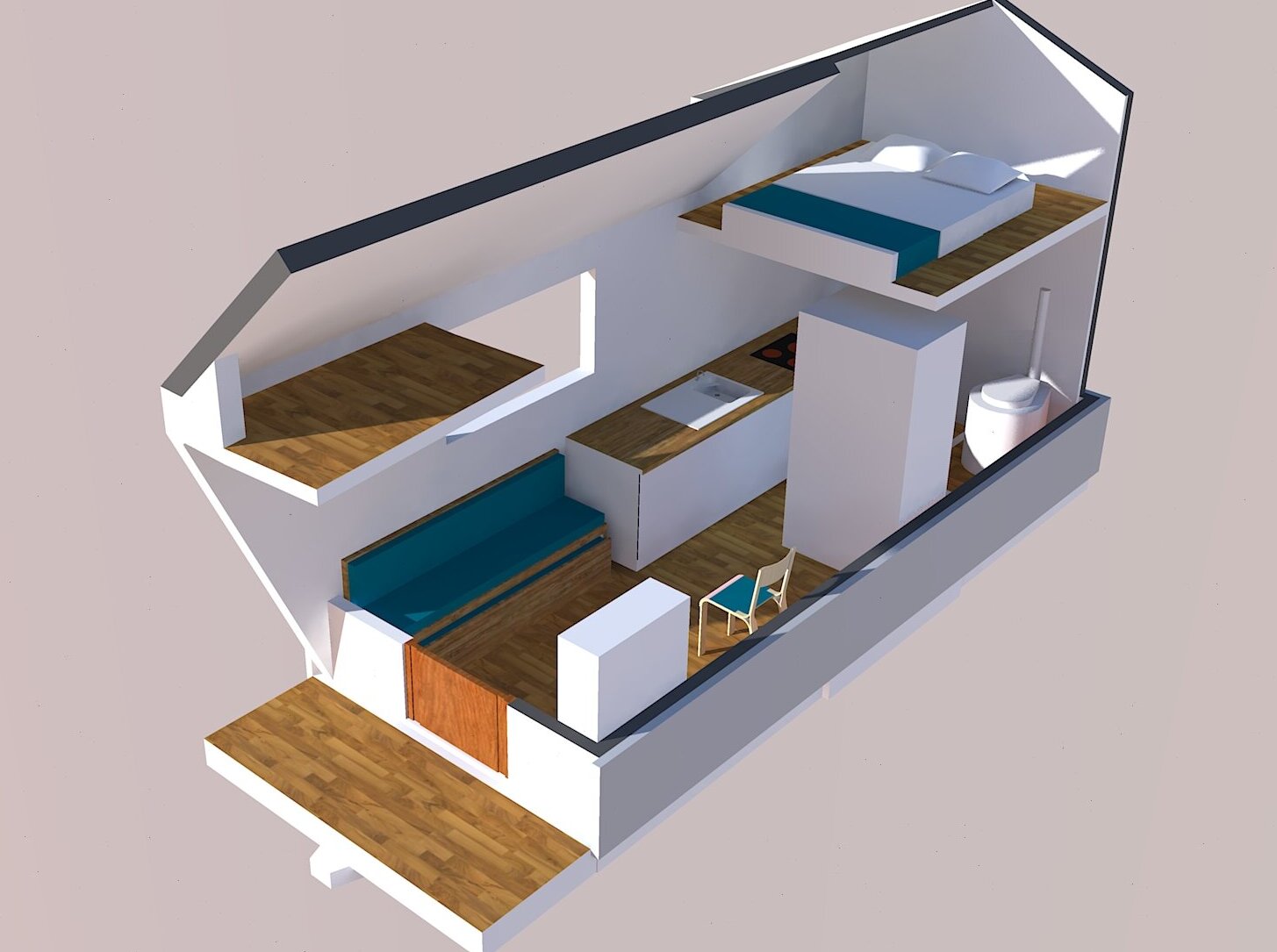 L'ensemble de l'habitation est fixé sur un châssis prévu spécifiquement pour cet usage. La largeur maximale de 2,5m nous permet de tracter la tiny house sans utiliser de convoi exceptionnel.